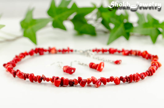 Natural Red Dyed Bamboo Coral Chip Choker Necklace and Earrings Set