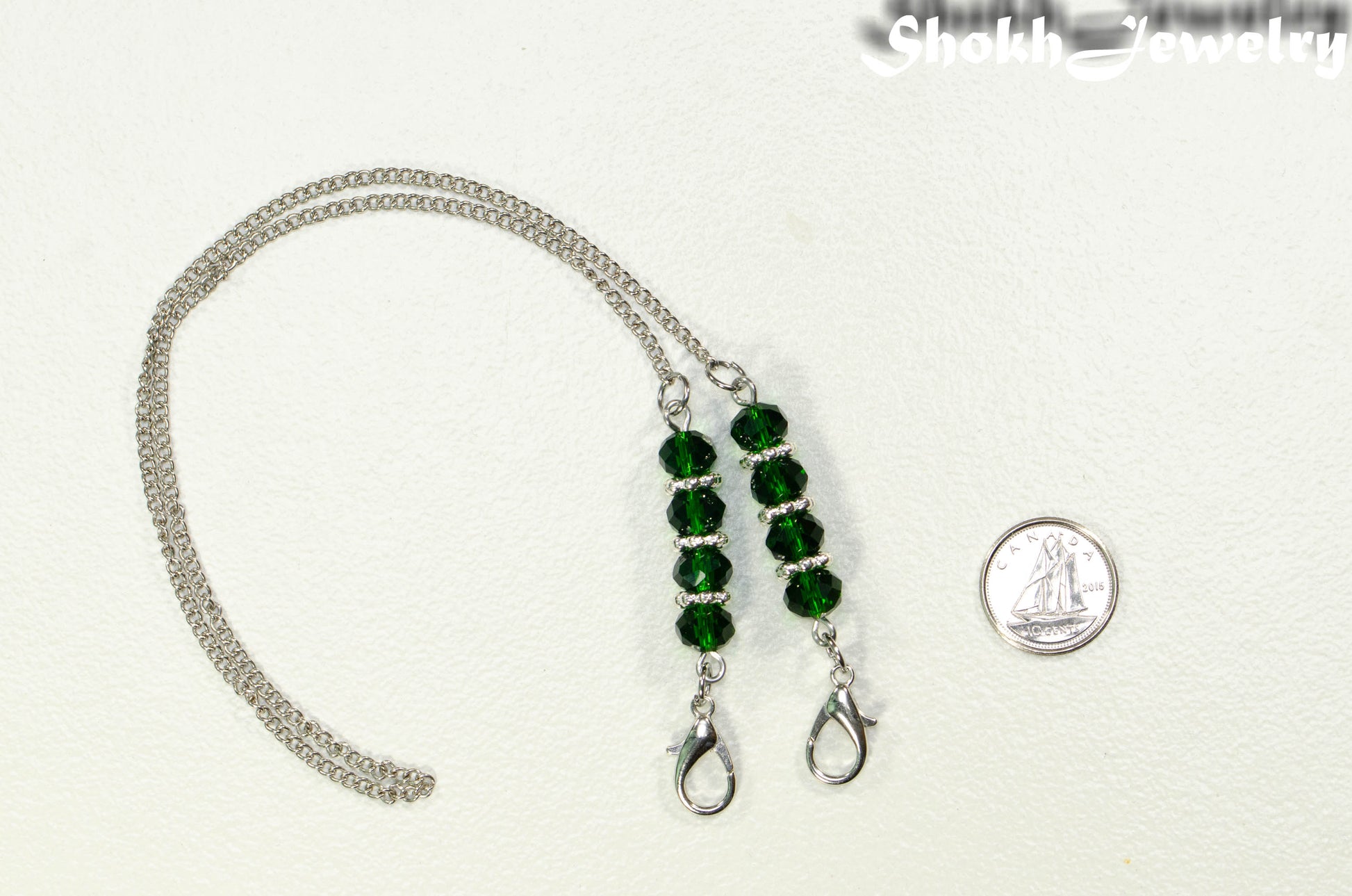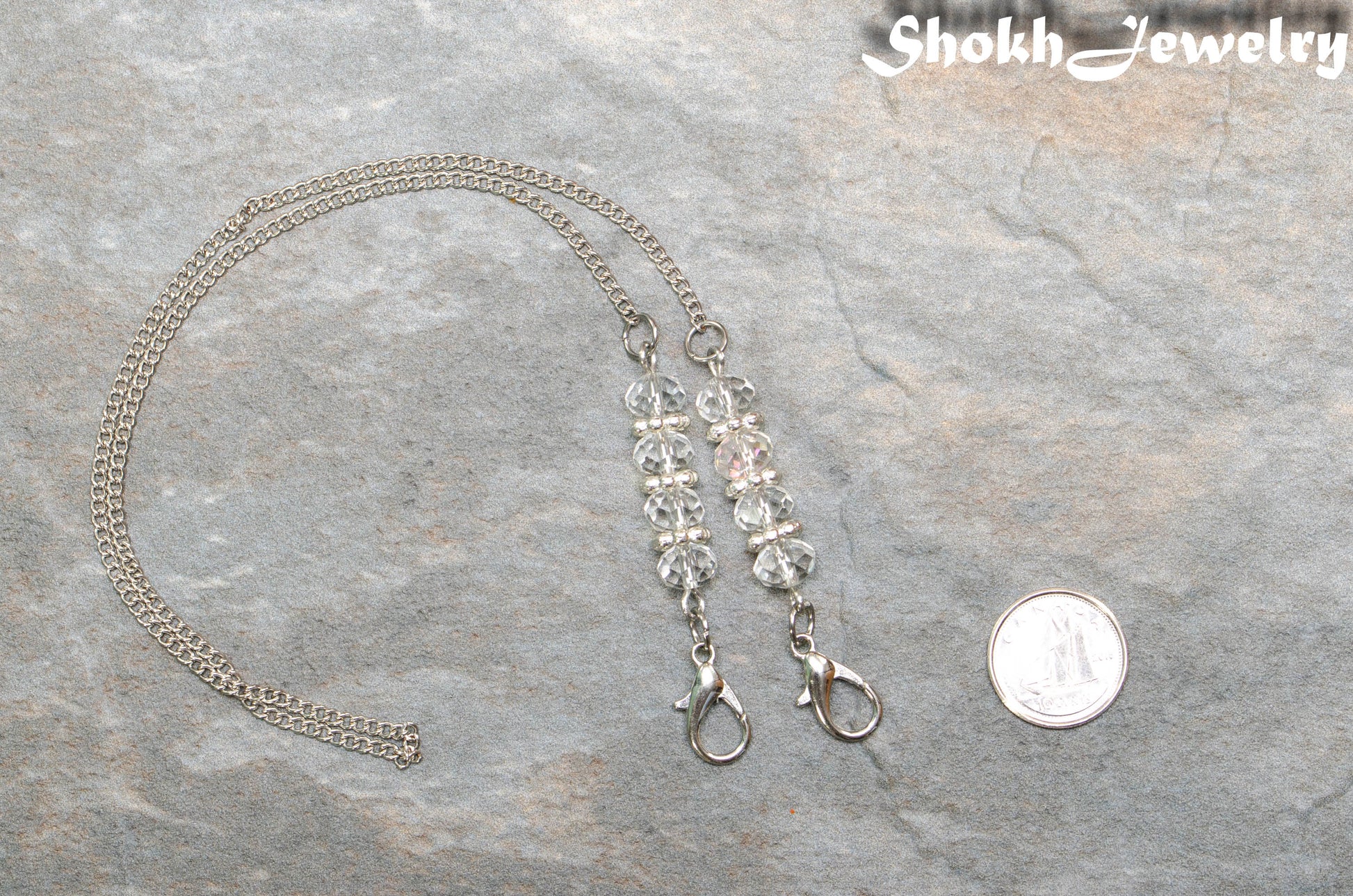 This simple and elegant mask lanyard/eyeglass chain is made with faceted glass crystal beads, silver plated spacer beads, lobster claw clasps and stainless steel chain. Please choose the colour of the glass crystal beads from the drop down menu.